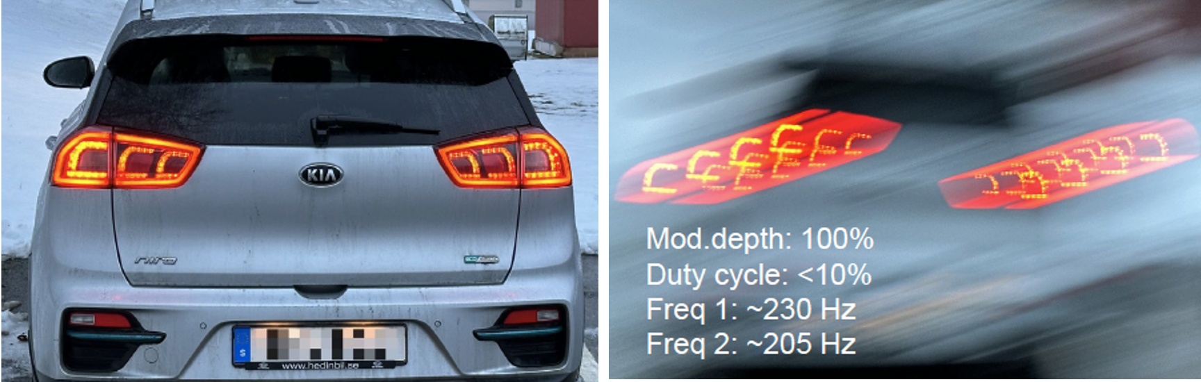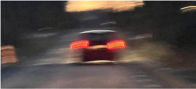 Das fahrende Auto erscheint mit einer Reihe von nicht existierenden Rücklichtern. Auf einem anderen Bild zeigt der Autor sein Auto und dessen Erscheinung infolge des Effekts.