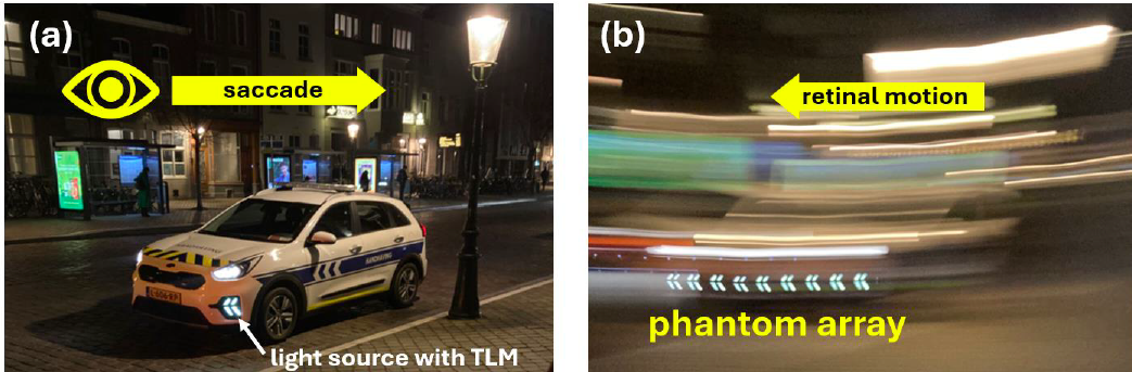 Sie mit dem wissenschaftlichen Namen Phantom-Array-Effect ist ein visueller Effekt, den ein menschlicher Beobachter wahrnimmt, wenn er schnelle Augenbewegungen über eine Lichtquelle ausführt, die eine zeitliche Lichtmodulation bei Frequenzen zwischen etwa hundert Hz und einigen kHz aufweist: In Richtung der Augensakkade wird eine Reihe von mehreren Scheinbildern der Lichtquelle gesehen. Zwar kann das Gehirn das Sehen während jeder Sakkade blitzschnell ausschalten. Es kann aber mit den LEDs nicht mithalten. So entstehen Geisterbilder.