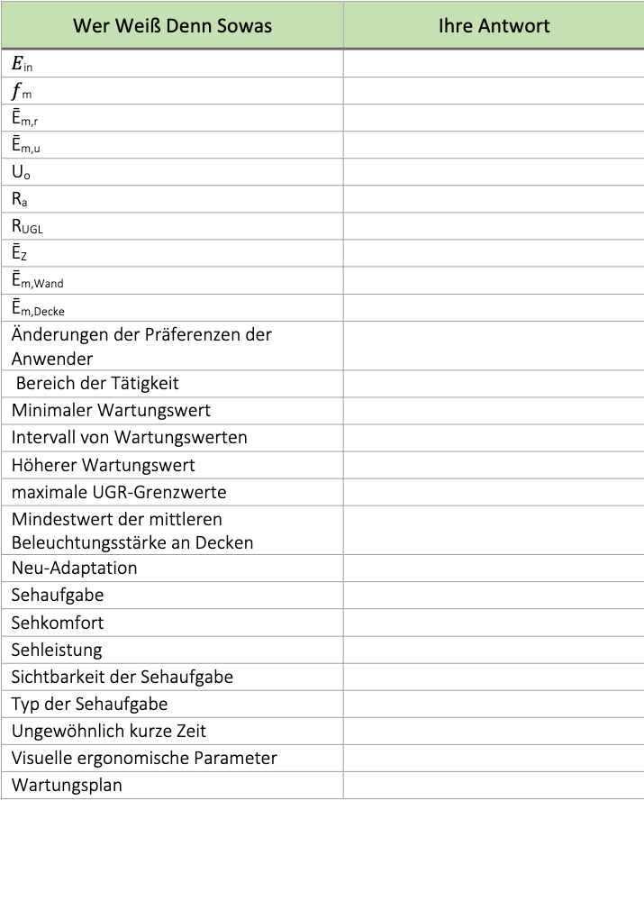 Wenn der Lichtplaner all dies hinter sich hat, kann er sich endlich seiner Aufgabe widmen: als „Regisseur des Lichts“ dafür sorgen, dass die Räume durch die richtige Beleuchtung erst richtig zur Geltung kommen, funktional sind und die gewünschte Stimmung erzeugen. Gesund und sicher muss die Beleuchtung auch sein. (Bitte versuchen, die Tabelle auszufüllen und das Ergebnis anhand der genannten Dokumente zu überprüfen.)