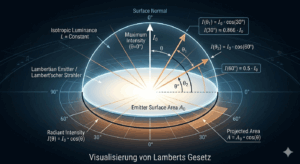 Der Beitrag erklärt, warum das Lambertsche Gesetz – ein mathematisches Modell für ideal diffuse Reflexion – in der realen Beleuchtungspraxis häufig zu Fehlinterpretationen führt. Ein Lambert‑Strahler würde in alle Richtungen gleich hell erscheinen, doch kein reales Material verhält sich exakt so. Trotzdem wird dieser Idealzustand in vielen Normen und Berechnungen impliziert.
